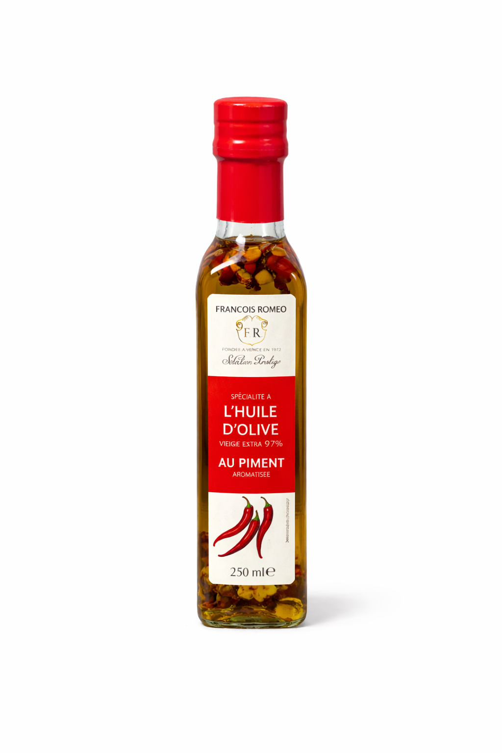 Ingrédients : Huile d’olive vierge extra 97%, Piment 1,2%, Arôme piment 2%